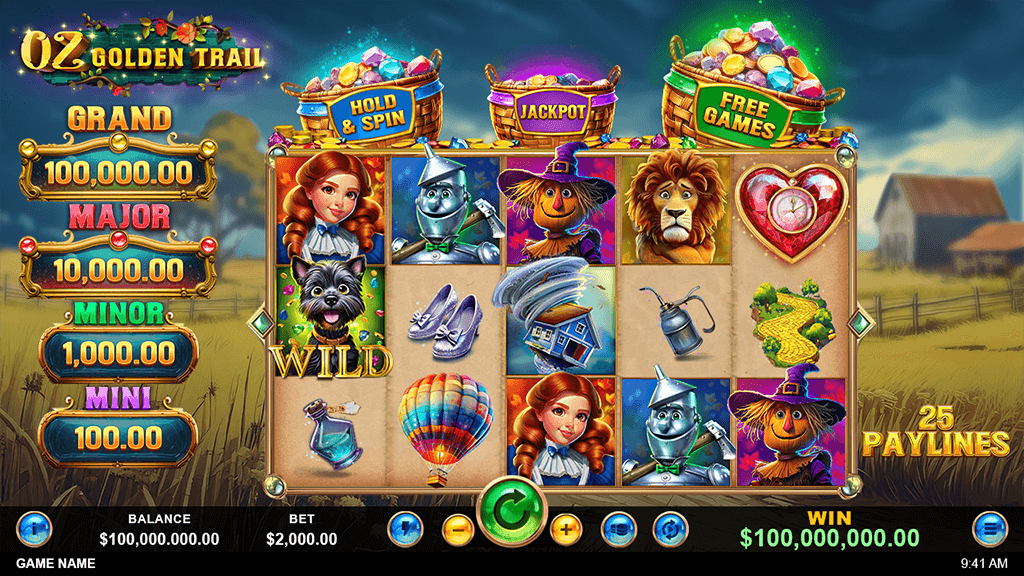Oz Golden Trail GAME FEATURES Volatility: Medium Paylines: 25 Free Spins Eligible?: Yes Top Award: 50,000 times the bet per line Reels: 5 Volatility